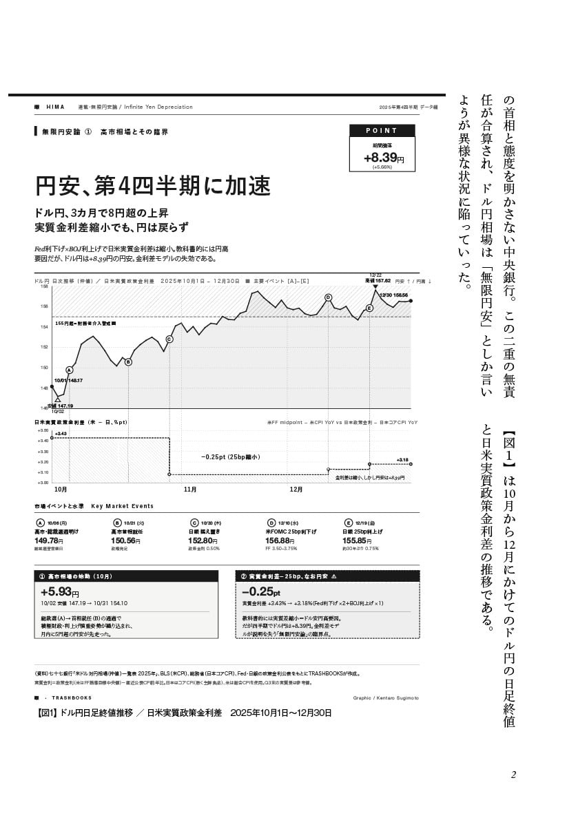 高市政権の「責任ある積極財政」と、29年にわたって失敗を弥縫してきた日銀の主要政策。FTPL(価格水準の財政理論)を補助線に金利差モデルが効かなくなった「無限円安」の臨界点を描く。大厚木の一番街では円安インフレで追い詰められたそば屋の店主が泥酔し、床にぶっ倒れている。通貨没落のもっとも微細でもっとも確実な指標を片山財務大臣に宛てて報告する。マザー・テラサワによるAI時代の創作論も収録。